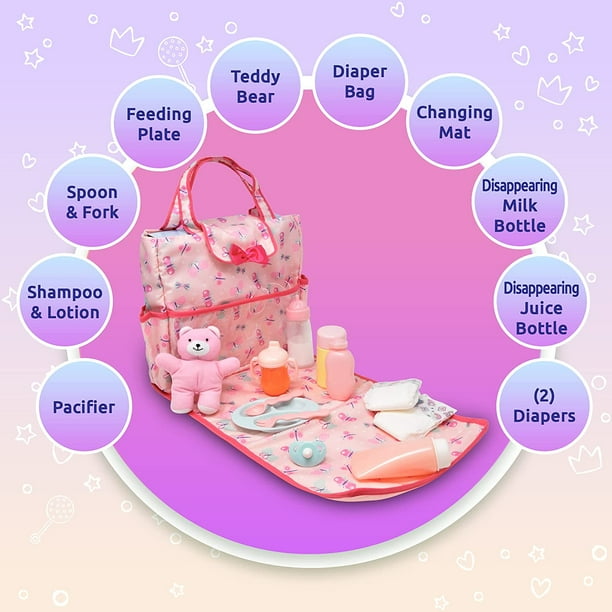 Baby Doll Diaper Bag With Accessories Doll Care Kit Changing Set Includes Magic Disappearing Milk Bottle Juice Bottle Diapers Feeding Plate Pacifier Teddy Bear Walmart Ca